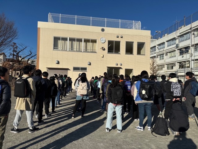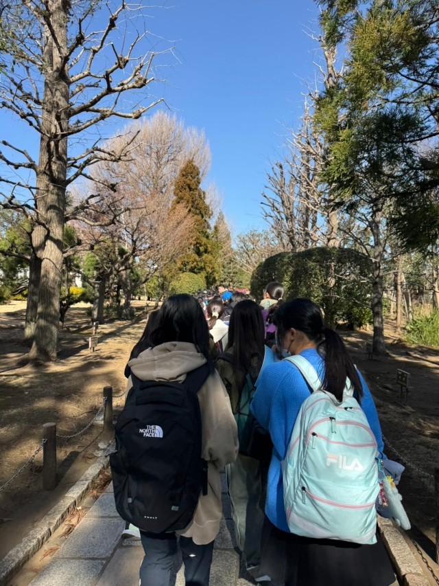 中央広間には議会政治確立に功労のあった伊藤博文、板垣退助、大隈重信の銅像があり、4階吹抜きで、窓と天井には大きなステンドグラスがありました。衆議院を見学後、正門のところでクラスごとに写真撮影をしました。門の近くには都道府県から贈られた木が植えられており、茨城県から贈られた梅の木の花が咲いていました。その後、参議院の特別体験プログラムをする為に移動しました。