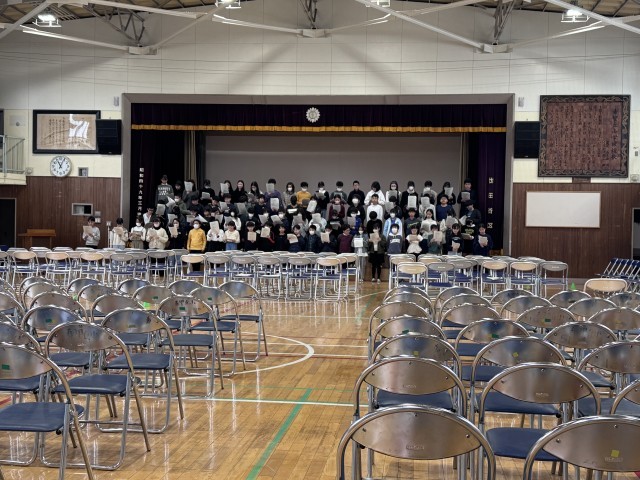 今週から卒業式練習が始まりました。合唱隊形の確認、流れや所作の確認等覚えることはたくさんありますが、日に日に上手になってきています。毎日練習がありますので、ご家庭では体調管理のご協力をお願いします。