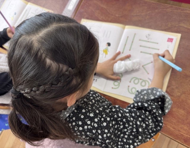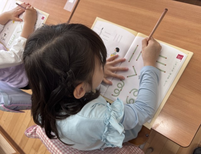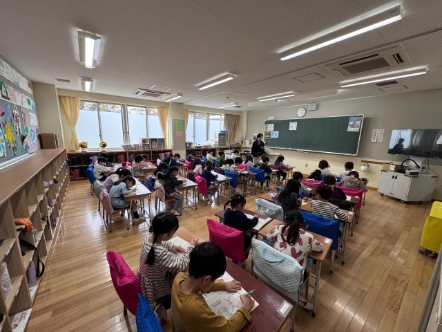 入学してから4日が経ちました。教師の話を聞いて一生懸命取り組む姿がいろいろなところで見られます。昨日は字を書く姿勢や鉛筆の持ち方を学習しました。今日の学習では、鉛筆を使っていろいろな線を書き、初めて自分の名前を書きました。一文字一文字丁寧に書いている姿がとても印象的でした。次回からはいよいよひらがなを習います。「もっとたくさん書きたい!」という声が聞こえてきました。持ち物の準備等もありがとうございます。