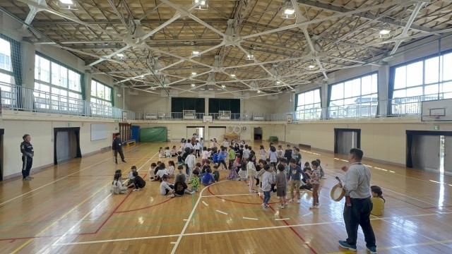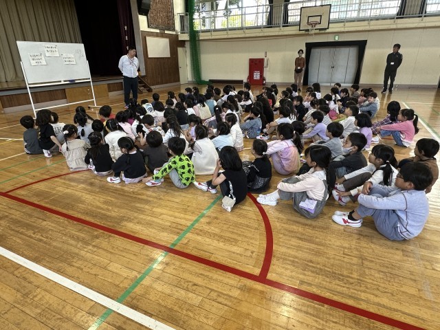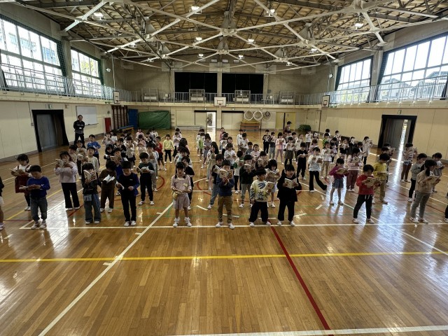 今日は、1年生全員で体育館に集まり、学年集会を行いました。各担任やサポートしてくれる先生の話を聞きました。1年生の目標として①自分のことは自分でする②友達のことを認めるの2つを確認しました。その後は猛獣狩りのレクをして、みんなで楽しみました。続けて音楽の学習も体育館で行いました。校歌の練習をしたり、音楽に合わせて体を動かしたりしました。