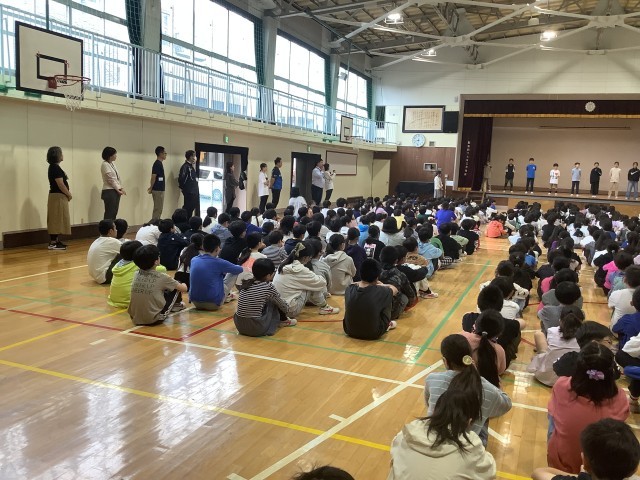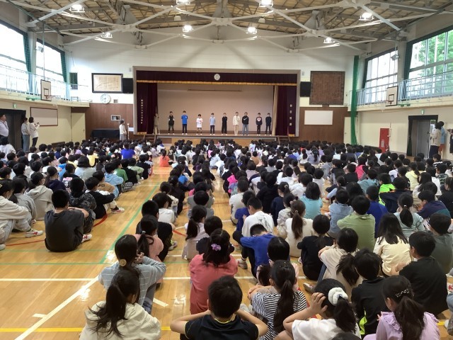体育館で委員会紹介集会がありました。10の委員会の委員長が、仕事の内容や頑張りたいこと、お知らせなどを全校に発表しました。代表として話している委員長を応援するかのように見守る6年生の聞く姿勢も立派でした。同じ気持ちで心を一つに取り組んでいることが伝わってきました。1年間、5年生と6年生が協力して委員会活動を進めていきます。