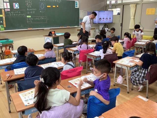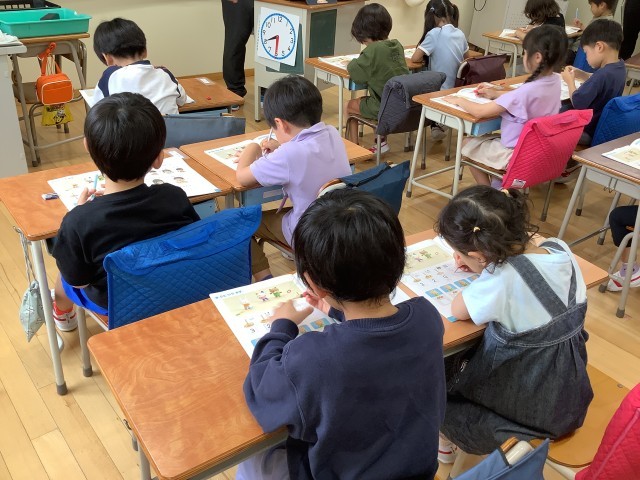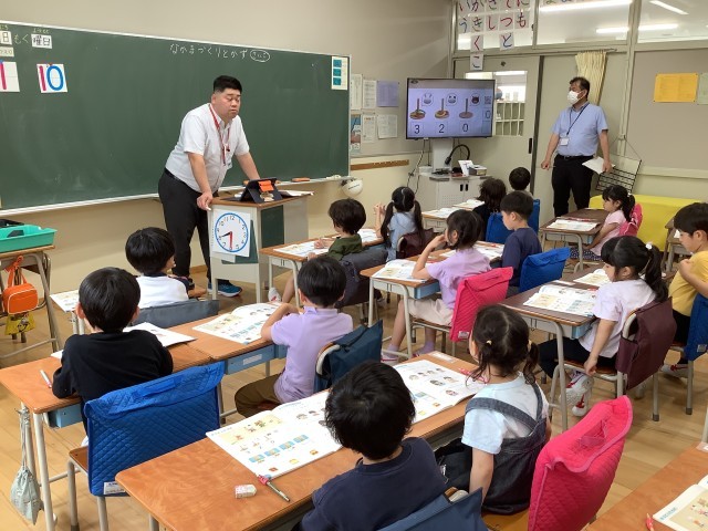 1年生の算数では、数の学習をしています。今日は輪投げ遊びの場面から、輪が1つも入らなかったときはどのように表したらよいか考えました。1つもないことを「れい」と表すと良いことを見付けて、書き方や読み方を練習しました。最後は友達と数を唱える活動をして楽しく学習しました。5時間目でしたが集中して学習できました。
