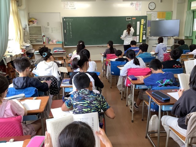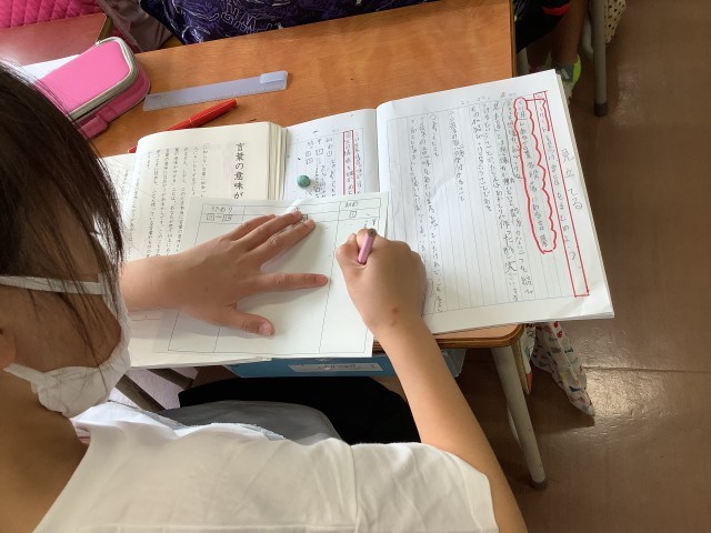 5年生の国語では説明文を読む学習をしています。今日は「言葉の意味が分かること」の文章構成を考えていきました。全部で12ある段落を、初め・中・終わりの3つに分けた後、中の段落にもまとまりがあることに気付いて話し合いました。近くの友達と上手に意見を交流しながら読み進めました。
