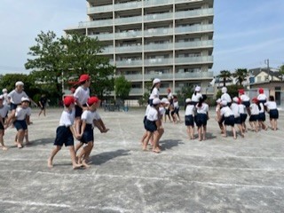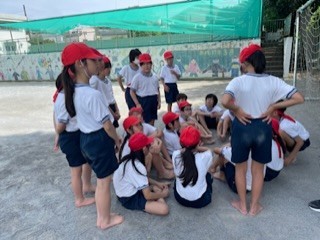騎馬戦の練習もいよいよ終盤になってきました。赤組や白組、それぞれ輪になって作戦を真剣に考えていました。練習を積み重ねることで、どんどん上達している子どもたたち。残り数日、安全に気を付けてラストスパートをかけていきます。