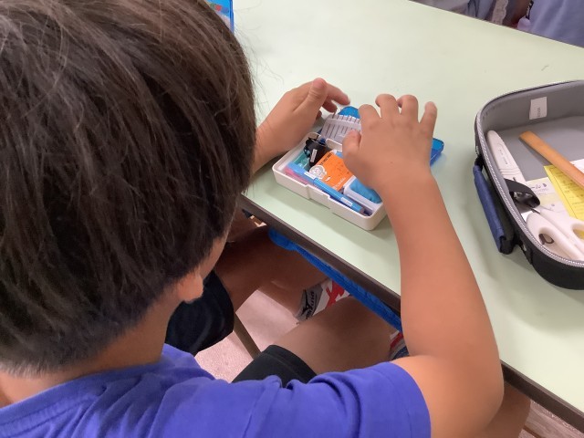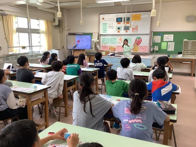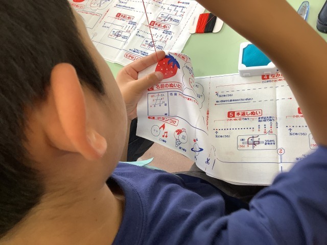 5年生の家庭科の学習では裁縫が始まりました。今日は玉結びや玉どめの手順を覚えて練習しました。針の本数を数えるところから始めて玉結びを練習した後、練習布のいちごの種のつぶつぶを玉どめで縫い付けました。「あぁ、玉どめが浮いてしまった…」と苦戦しながらも頑張っていました。