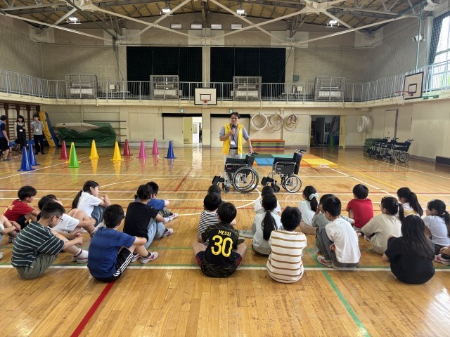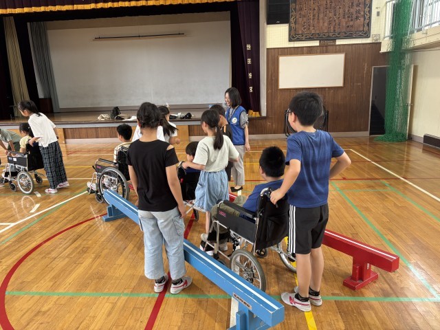 総合的な学習の時間は福祉について学習しています。今日は、社会福祉協議会の方にお越しいただき、車いす体験を行いました。実際の道を想定したコースを通り、車いすに乗る人の不安や押す人の難しさを体験することができました。