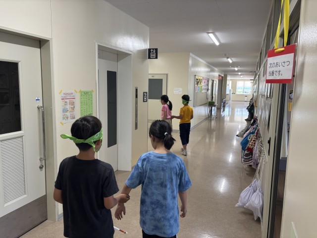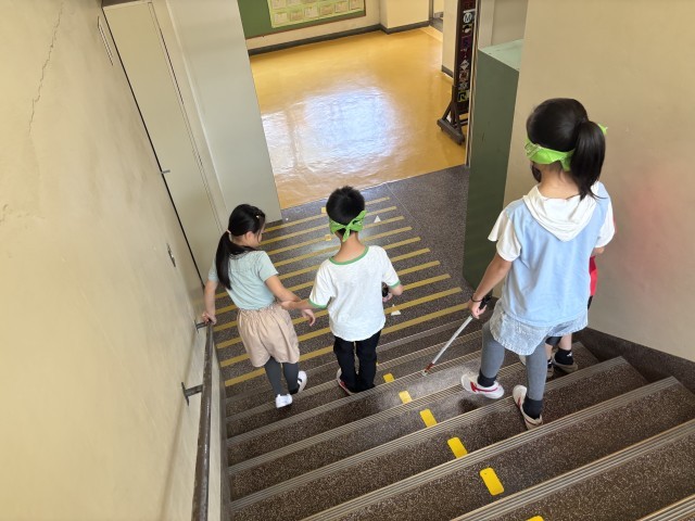 総合的な学習の時間に白杖体験を行いました。段差、階段、曲がり角があるコースをペアになり進みました。介助する人、白杖を使用する人の役割を体験して「想像したよりも怖かった。」「階段で白杖を使うのが難しかった」など、さまざまなことに気付きました。これらの体験を基に、自分たちができることを考えていきます。