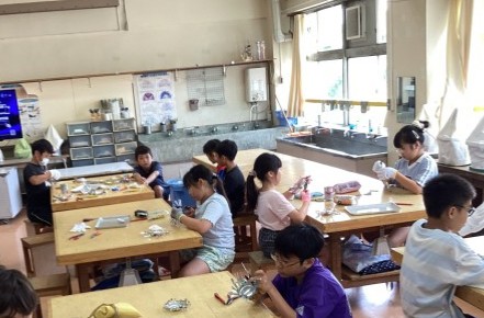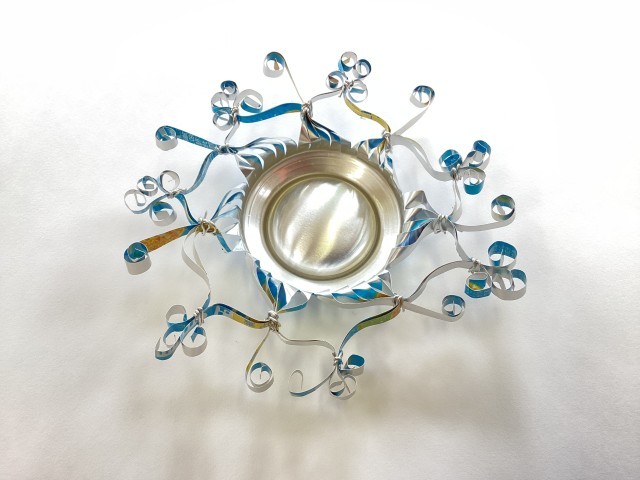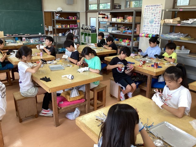 5年生はアルミ缶をハサミで切ったり、曲げたりして、金属の加工について学んでいます。何人かの児童は作品が出来上がってきました。写真は出来上がった児童の作品です。