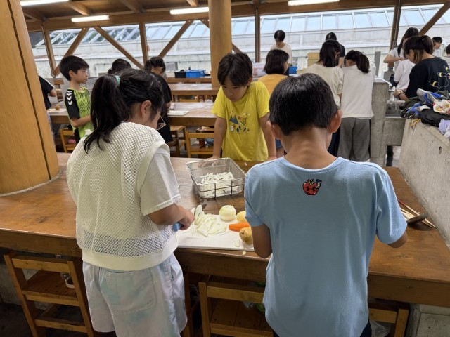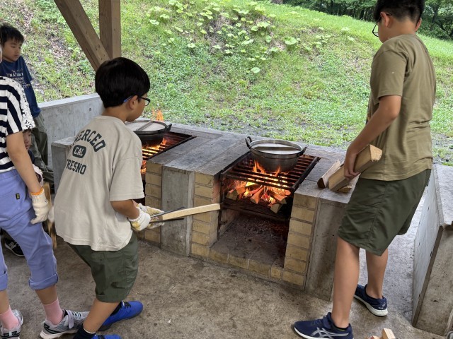 これから飯ごう炊さんを行います。事前に調理計画も立て、かまど係、野菜を切る係などそれぞれの担当に分かれて調理します。初めての調理工程もありますが、安全に気を付けながら協力して行っています。出来上がるのが、楽しみです!