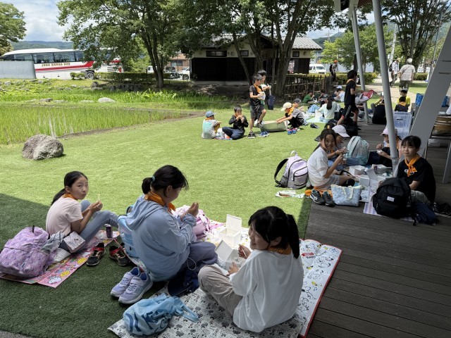 村めぐりも終わり、田園プラザで昼食と最後の買い物をしました。残ったお金を一生懸命計算しながら、満足のいく買い物ができたようです。これからバスに乗って、学校に向けて出発します!