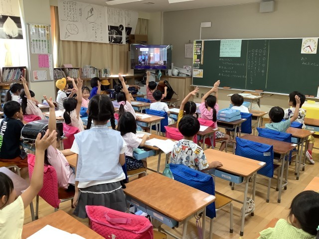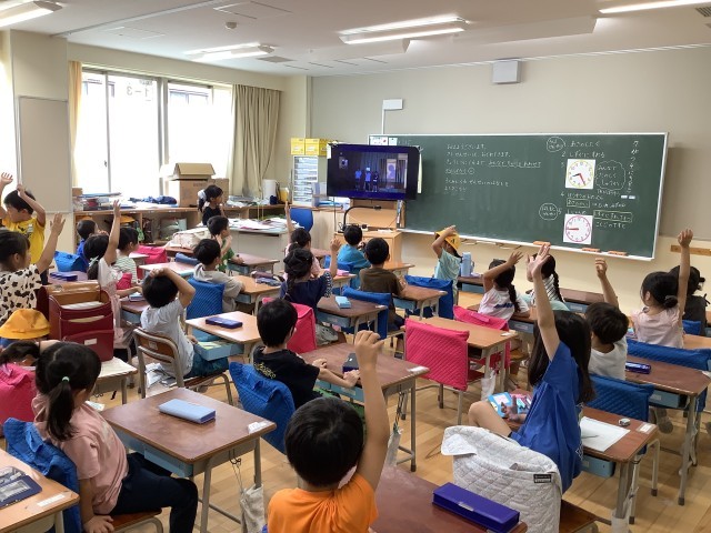 みんなで楽しく集会がありました。暑い日が続いているため、体育館ではなくテレビ放送で行いました。今日は集会委員会の5・6年生が企画したシルエットクイズをみんなで楽しみました。先生たちの影(シルエット)を見て、名前を当てるクイズをしました。正解すると「やったあ」と大喜び。1年生も嬉しそうに参加して盛り上がっていました。