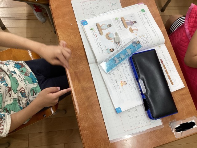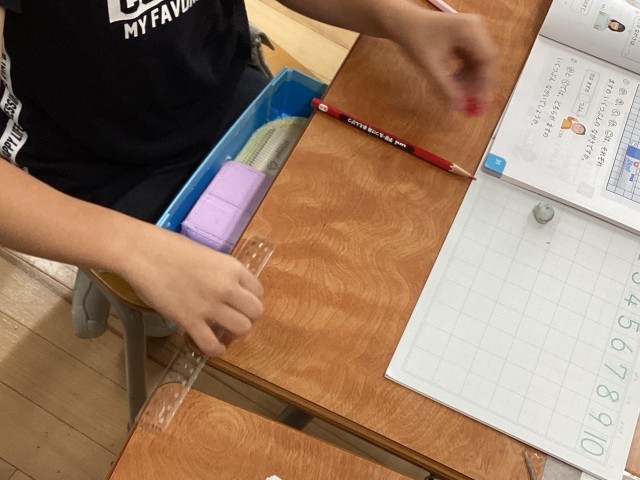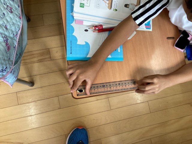 1学期最後の算数の単元は「どちらがながい」です。今回は身の回りにあるものの長さを、任意単位(鉛筆や指の幅、消しゴムなど)を使って比べる活動をしました。それぞれ何を単位にするのかを決めて長さを測り、「〜のいくつ分」で長さを比べられることが分かりました。