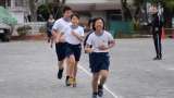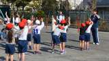 校庭に石灰であらかじめ担任が描いた「川」。これを、いろいろな跳び方で超すのが今日...