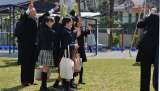 見送りが終わった後も、名残惜しい子どもたちは校庭で記念撮影。満面の笑みがこぼれま...