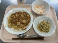 ◆献立◆麻婆豆腐焼きそば中華あえフルーツヨーグルト牛乳