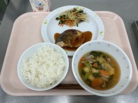 ◆献立◆ごはん(秋田県産あきたこまちの有機米)ぶりの照り焼きわさび和え白玉汁牛乳