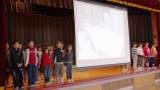 29日、今日の集会は4年生の発表です。体育館で大スクリーンに写真を映しだして発表...