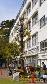校庭の背の高い樹木の剪定を、区の用務班の皆さんにしてもらいました。本校の主事の手...