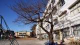 もう一つ自然のようすを。ランチルーム前の校庭にそびえ立っている桜の木。おなじみで...