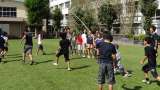 遊び場開放委員会主催の飯ごう炊さんが校庭で行われ、子どもたちがカレー作りに腕をふ...