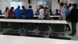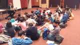 スタジオに入って、放送についてのお話を聞いています。みんな真剣です。