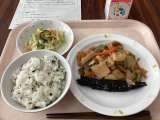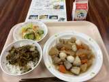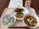 献立 有機米ごはん 牛乳 切り干し大根の卵焼き 野菜のおかかかけ 具だくさんみそ...