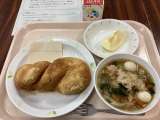 献立 あげパン(きなこ) 牛乳 肉団子入り春雨スープ くだもの(りんご)