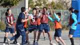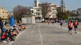 持久走の開始です。2グループに分かれ、後半に走る子は、担当になっている子のタイム...