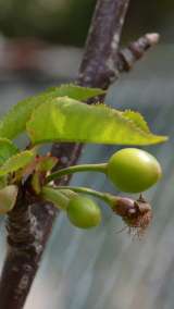 学校の敷地に植えてある様々な樹木の実が育っています。左からサクランボ、ウメ、リン...