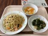 ☆献立☆ 五目焼きそば 牛乳 大根の中華味 フルーツ白玉 ☆食材☆ 冷凍えび・...