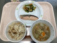 ◆献立◆たけのこごはん鮭の西京焼き野菜のおかかかけ豚汁牛乳