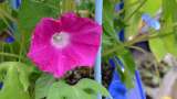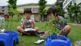 1年生の子どもたちがアサガオに水やりしながら大喜び。花が咲き始めたのです。よく見...