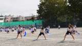 29日午後、5・6年生の練習中につむじ風が! 演技の準備をしていたグループがつむ...