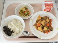 【今日の献立】・ごはん・ひじきのふりかけ・肉じゃがのカレー煮・野菜のしょうが風味...
