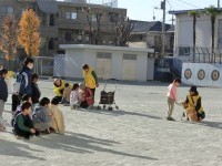校庭でなわとびをしました。大きな縄を回しながら、タイミングを合わせて跳ぶことに子...