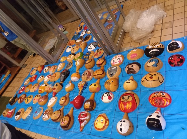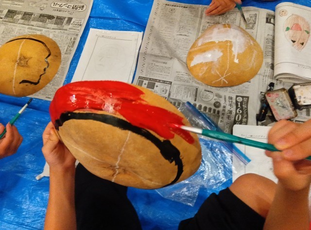 一つ一つ形が違うふくべに、思い思いに絵を描き、個性豊かな作品に仕上げました。