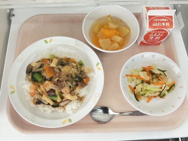 9月25日の給食 公開日 2025/09/25 更新日 2025/09/25 給食 【今日の献立】・中華丼・ピリ辛野菜・フルーツポンチ・牛乳【使用した食材の主な産地】にんにく/青森 しょうが/高知 にんじん/北海道 たまねぎ/北海道 はくさい/長野 ねぎ/青森チンゲンサイ/茨城 キャベツ/群馬 きゅうり/長野 給食