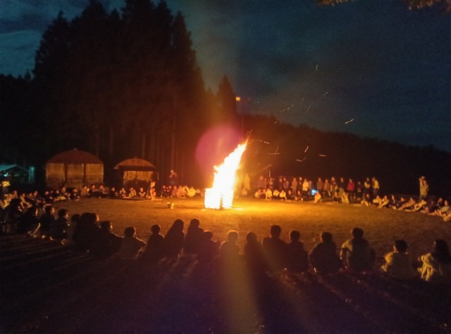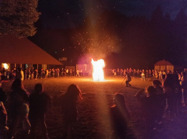 【5年生】川場移動教室 キャンプファイヤー 公開日 2025/10/06 更新日 2025/10/06 5年生 燃え盛る炎の周りで、キャンプファイヤー係を中心にダンスを踊ったりゲームをしたりして、学年みんなで1日目を締めくくりました。