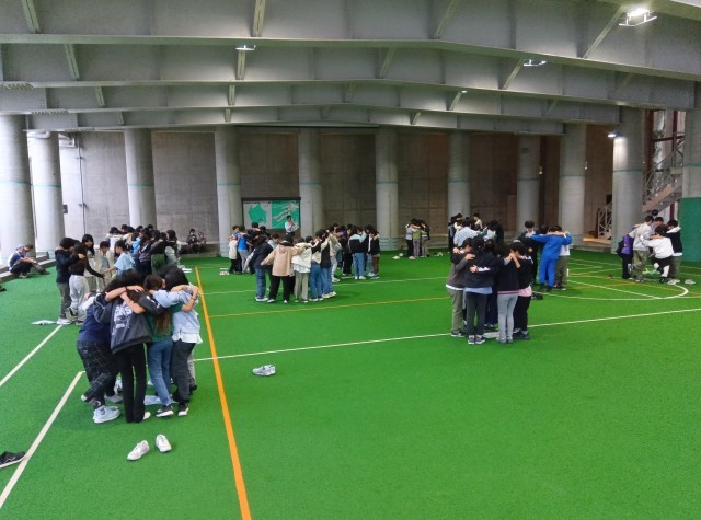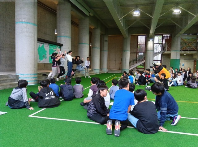 【5年生】川場移動教室 館内レク1 公開日 2025/10/07 更新日 2025/10/07 5年生 雨天により、ハイキングが中止になり、館内の屋根付き広場でレクリエーションを行いました。急な変更でしたが、学年全体でゲームを楽しむことができました。
