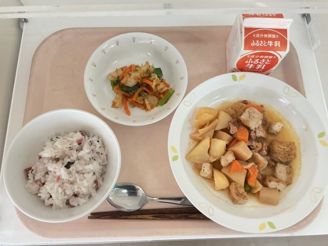 11月11日の給食 公開日 2025/11/11 更新日 2025/11/11 給食 【今日の献立】・梅わかごはん・生揚げと野菜の煮物・野菜のおかか和え・牛乳【使用した食材の主な産地】にんじん/北海道 じゃがいも/北海道 はくさい/群馬 こまつな/埼玉 給食