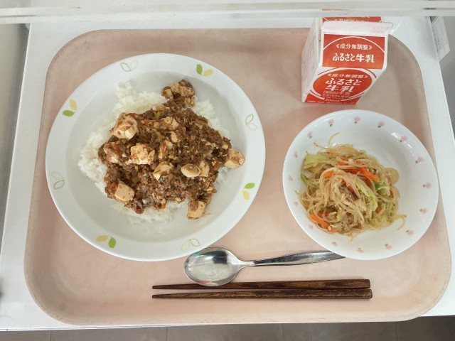 11月13日の給食 公開日 2025/11/13 更新日 2025/11/13 給食 【今日の献立】・マーボー丼・春雨サラダ・牛乳【使用した食材の主な産地】にんにく/青森 しょうが/高知 ねぎ/青森 にんじん/北海道 キャベツ/茨城 もやし/栃木 給食