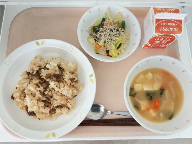 3月12日の給食 公開日 2026/03/12 更新日 2026/03/12 給食 【今日の献立】・牛肉ごはん・じゃこサラダ・みそ汁・牛乳【使用した主な食材の産地】にんにく/青森 しょうが/高知 たまねぎ/北海道 にんじん/千葉 セロリ/愛知りんご/青森 じゃがいも/北海道 キャベツ/愛知 きゅうり/群馬 給食