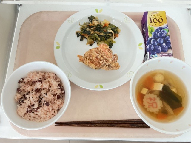 3月19日の給食 公開日 2026/03/19 更新日 2026/03/19 給食 【今日の献立】・お赤飯・鶏肉のからあげ・煮浸し・お祝い汁・ぶどうジュース【使用した食材の主な産地】しょうが/高知 こまつな/埼玉 はくさい/茨城 にんじん/千葉 えのきたけ/新潟ねぎ/千葉 給食