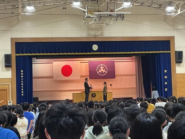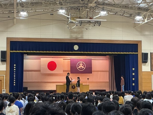 1年生の児童代表からは、学校に来る前に朝の勉強を頑張ってテストで100点を取ったこと、5年生の児童代表からは、運動会の実行委員等で努力したので達成感を得ることができたとお話がありました。
