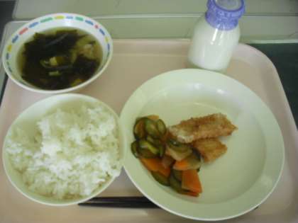 今日の給食 公開日 2012/11/29 更新日 2012/11/29 その他の教育活動 今日は、わかめスープが人気でした。(11月29日) 《今日の食材産地》 たまねぎ:北海道 にんじん:北海道 だいこん:千葉県 カットさつまいも:群馬県 きゅうり:埼玉県 ねぎ:埼玉県 キャベツ:埼玉県 鶏もも:鹿児島、宮崎、岩手県 豚ひき肉:千葉県 鶏ガラ:青森県 いか:青森県