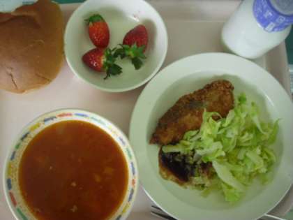 今日の給食 公開日 2012/12/10 更新日 2012/12/11 その他の教育活動 今日は、魚のフライが一番人気でした。(12月10日) 《今日の食材産地》 玉ねぎ:北海道 にんじん:千葉県 じゃがいも:北海道 ほうれん草:神奈川県 ねぎ:千葉県 キャベツ:埼玉県 もやし:神奈川 豚もも:宮崎県 鶏がら:青森県 メルルーサ:アルゼンチン いちご:栃木県