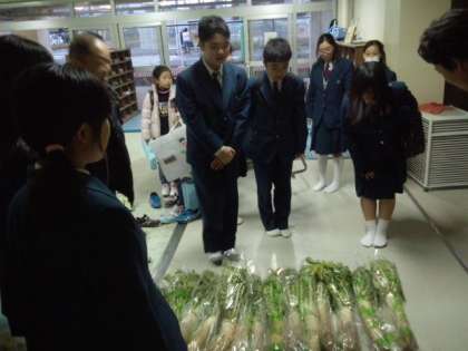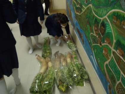 放課後に、喜多見中学校の生徒が育てた大根を運んできてくれました。(12月18日)