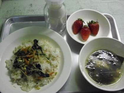 今日の給食 公開日 2013/01/25 更新日 2013/01/25 その他の教育活動 今日は苺が出ました。甘くてみずみずしい、とても美味しい苺でした。(1月25日) 《今日の食材産地》 たまねぎ:北海道 にんじん:千葉県、茨城県 じゃがいも:長崎県 きゅうり:沖縄県 ねぎ:千葉県 ほうれん草:神奈川県 キャベツ:埼玉県 もやし:神奈川県 鶏もも:宮崎県 豚もも:宮崎県 鶏ひき肉:岩手、宮崎県 苺:栃木県