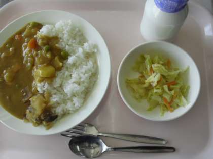 今日の給食 公開日 2013/02/01 更新日 2013/02/01 その他の教育活動 今日はみんなが大好きなカレーライスでした。アップルソース入りの甘口のカレーでした。(1月31日) 《今日の食材産地》 たまねぎ:北海道 にんじん:千葉県 じゃがいも:長崎県 カットさつまいも:群馬県 キャベツ:埼玉県 カットじめじ:長野県 豚もも:宮崎県 メルルーサ:アルゼンチン りんご:青森県