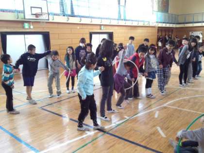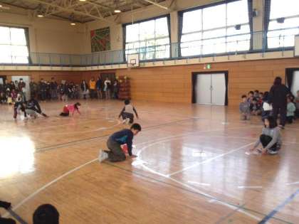 体育館で6年生と交流集会をしました。3つのゲームを考え、6年生と一緒に行いました。(2月9日)